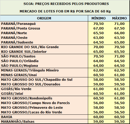 Em Mato Grosso, na região de Rondonópolis, o produtor se animou com a alta de preços proporcionada pela disparada do dólar e está mais ativo no mercado, principalmente para liberar espaço para a 2ª safra de de milho. Há registro de negócios para exportação a R$ 62,00 por saca de 60 Kg base Rondonópolis e a R$ 60,00 por saca de 60 Kg base Itiquira, posto fábrica, para entrega imediata e pagamento em 10 de junho. Nos últimos dias, as cotações registram avanço de R$ 3,00 por saca de 60 Kg. No Paraná, na região norte, o mercado está lento. No Porto de Paranaguá, a indicação é de R$ 72,00 por saca de 60 Kg, para embarque imediato e pagamento em sete de julho.