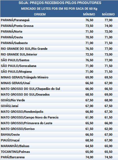 Em Mato Grosso, na região de Primavera do Leste, a indicação de compra mais alta é de R$ 65,60 por saca de 60 Kg, para retirada e pagamento em até 30 dias. Quanto à safra 2019/2020, os exportadores indicam, no máximo, R$ 67,00 por saca de 60 Kg, para entrega em fevereiro de 2020 e pagamento em março do mesmo ano. No Paraná, na região de Ponta Grossa, os compradores indicam R$ 74,00 por saca de 60 Kg, para entrega imediata e pagamento no começo de maio. No Porto de Paranaguá, a indicação é de R$ 76,50 por saca de 60 Kg, para entrega em maio e pagamento no fim de maio. Para a negociação antecipada da safra 2019/2020, a indicação de compra é de R$ 77,00 por saca de 60 Kg, para entrega em fevereiro e pagamento em maio do ano que vem e R$ 78,00 por saca de 60 Kg, para entrega em março e pagamento em maio de 2020.