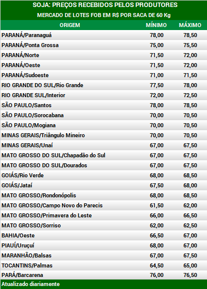 No Rio Grande do Sul, na região de Passo Fundo, os compradores indicam R$ 74,00 por saca de 60 Kg, para retirada imediata e pagamento até o fim de julho. No Porto de Rio Grande, a indicação de compra é de R$ 79,00 por saca de 60 Kg, para entrega imediata e pagamento em agosto. Quanto à comercialização antecipada da safra 2019/2020, a indicação de compra está entre R$ 79,00 e R$ 80,00 por saca de 60 Kg, para entrega em março e abril do ano que vem e pagamento em maio de 2020 no Porto de Rio Grande. Em Mato Grosso, na região de Campo Verde, os preços em queda afastam ainda mais os vendedores do mercado. A indicação de compra está entre R$ 66,50 e R$ 67,00 por saca de 60 Kg, para retirada em julho e agosto e pagamento em agosto. Com relação à soja da safra 2019/2020, os valores indicados por empresas consumidoras também estão em baixa. A indicação de compra é de R$ 67,00 por saca de 60 Kg na região de Rondonópolis e entre R$ 64,50 e R$ 65,00 por saca de 60 Kg na região de Campo Verde, para retirada em fevereiro e pagamento em março do ano que vem.