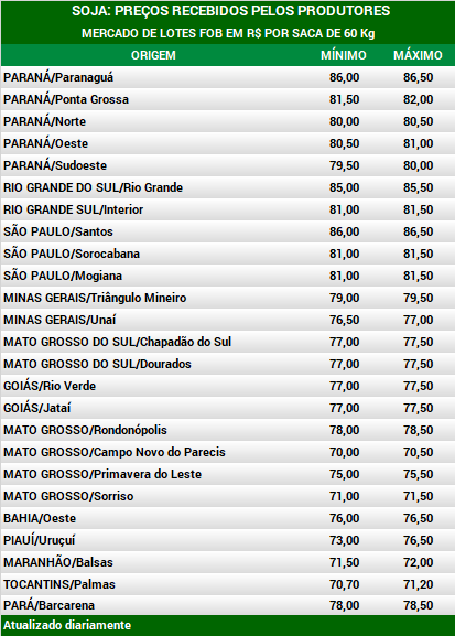 Em Mato Grosso, na região de Primavera do Leste, há negócios a R$ 75,00 por saca de 60 Kg FOB, para embarque e pagamento em outubro. Quanto à soja da safra 2019/2020, a indicação de compra é de R$ 68,00 por saca de 60 Kg FOB, para retirada em fevereiro e pagamento em março do ano que vem. No Paraná, na região dos Campos Gerais, a indicação de compra é de R$ 82,00 por saca de 60 Kg CIF Ponta Grossa, para entrega em outubro e pagamento no início de novembro. No Porto de Paranaguá, a indicação é de R$ 86,00 por saca de 60 Kg, para entrega em outubro e pagamento no início de novembro. Quanto às negociações antecipadas da safra 2019/2020, os compradores indicam R$ 81,00 por saca de 60 Kg CIF Ponta Grossa, para entrega em março/abril e pagamento em maio de 2020.