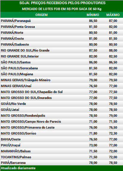 Com a forte alta dos futuros em Chicago, após a divulgação do relatório do USDA, os preços subiram com força no mercado físico brasileiro. Nos portos e no interior, as altas ficaram entre R$ 1,00 e R$ 1,50 por saca de 60 Kg. Os preços refletem ainda a combinação de um dólar que segue acima dos R$ 4,00 e os prêmios acima de +US$ 1,00 por bushel, apesar dos recuos recentes. Além do relatório do USDA, também vieram notícias de melhoras no clima entre China e Estados Unidos com relação à guerra comercial. O governo de Donald Trump estaria estudando a possibilidade de um acordo 'interino' com a China onde não só haveria o adiamento de algumas tarifas, mas também a retirada de parte delas. Isso aconteceria em troca de um comprometimento dos chineses em relação à propriedade intelectual e compras de produtos agrícolas.
