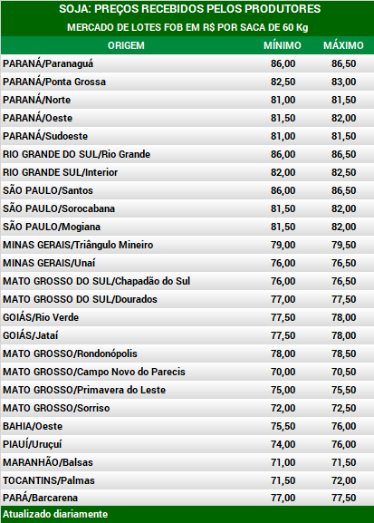 Nos últimos sete dias, o Indicador da soja Paranaguá ESALQ/BM&F, referente ao grão depositado no corredor de exportação e negociado na modalidade spot (pronta entrega), no Porto de Paranaguá, apresenta recuo de 0,7%, cotado a R$ 85,50 por saca de 60 Kg. A média ponderada da soja no Paraná, refletida no Indicador CEPEA/ESALQ registra queda de 0,1% nos últimos sete dias, a R$ 79,69 por saca de 60 Kg. Nos últimos sete dias, as cotações da oleaginosa registram alta de 1,0% no mercado de balcão (preço pago ao produtor) e de 0,2% no mercado de lotes (negociações entre empresas). O movimento baixista foi limitado pela valorização do dólar frente ao Real. Os valores de farelo e de óleo de soja, por sua vez, estão em alta. O farelo é impulsionado pela firme procura doméstica de suinocultores e o óleo de soja, pela demanda para produção de biodiesel. Algumas indústrias já relatam não ter lotes de óleo de soja para comercializar.