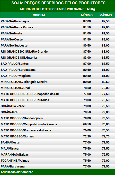 Em Mato Grosso, na região de Campo Verde, os compradores indicam R$ 78,00 por saca de 60 Kg FOB, para embarque em novembro e pagamento até o dia 30 do mesmo mês. Quanto à safra 2019/2020, a indicação de compra está entre R$ 73,50 e R$ 74,50 por saca de 60 Kg FOB, para embarque em janeiro e pagamento até o dia 25 de fevereiro de 2020. No Paraná, na região de Ponta Grossa, a indicação de compra para exportação está entre R$ 83,00 e R$ 84,00 por saca de 60 Kg, para retirada em novembro e pagamento na metade de dezembro. No Porto de Paranaguá, a indicação é de R$ 87,00 por saca de 60 Kg, para os mesmos prazos. Para entrega em fábricas de Ponta Grossa em novembro e pagamento no fim de novembro, a indicação de compradores é de R$ 81,00 por saca de 60 Kg. Quanto à safra 2019/2020, a indicação é de R$ 81,00 por saca de 60 Kg.