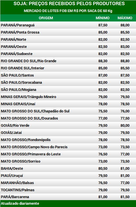 No Rio Grande do Sul, a indicação de compra no Porto de Rio Grande está entre R$ 88,00 e R$ 88,30 por saca de 60 Kg, para entrega até o início de fevereiro e pagamento na primeira semana do mês que vem. Para retirada imediata na região de Cruz Alta, a indicação de compra é de R$ 85,00 por saca de 60 Kg, para pagamento na primeira semana de fevereiro. Para prazos mais longos, a indicação é de R$ 88,00 por saca de 60 Kg no Porto de Rio Grande, para entrega em abril e pagamento no fim de abril.