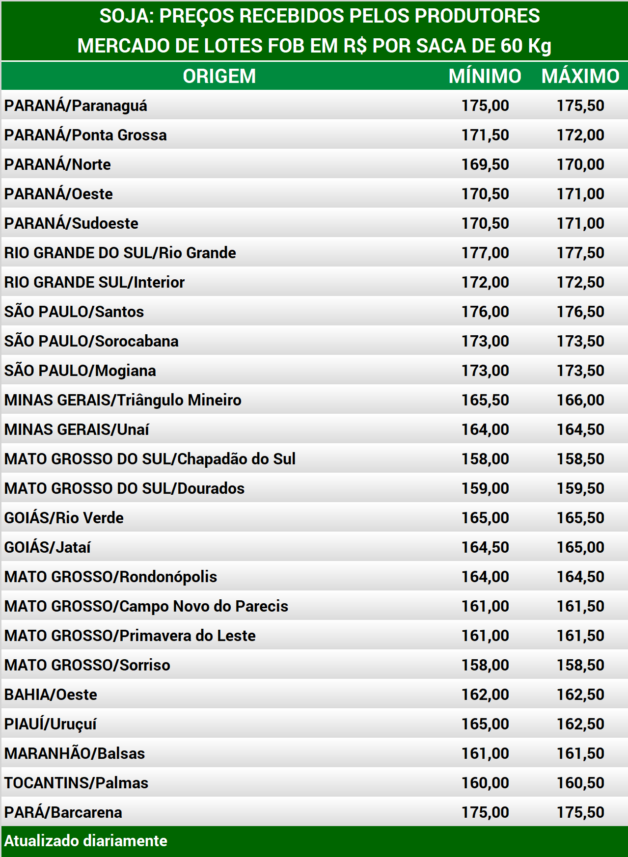 Em Mato Grosso do Sul, na região de Dourados, há registro de negócios no spot, para exportação, a R$ 160,00 por saca de 60 Kg FOB, para retirada imediata e pagamento no fim de abril. Em relação à soja futura, o mercado está parado. As indicações de compra giram em torno de R$ 145,00 por saca de 60 Kg FOB, para retirada em fevereiro e pagamento em março de 2022. No Paraná, na região oeste, os compradores indicam R$ 167,00 por saca de 60 Kg FOB, para retirada e pagamento até o fim do mês. No Porto de Paranaguá, a indicação está entre R$ 175,00 e R$ 176,00 por saca de 60 Kg, para entrega em abril e pagamento em maio. Para a safra 2021/2022, tradings indicam R$ 162,00 por saca de 60 Kg no Porto de Paranaguá em fevereiro do ano que vem, com pagamento no mês seguinte.