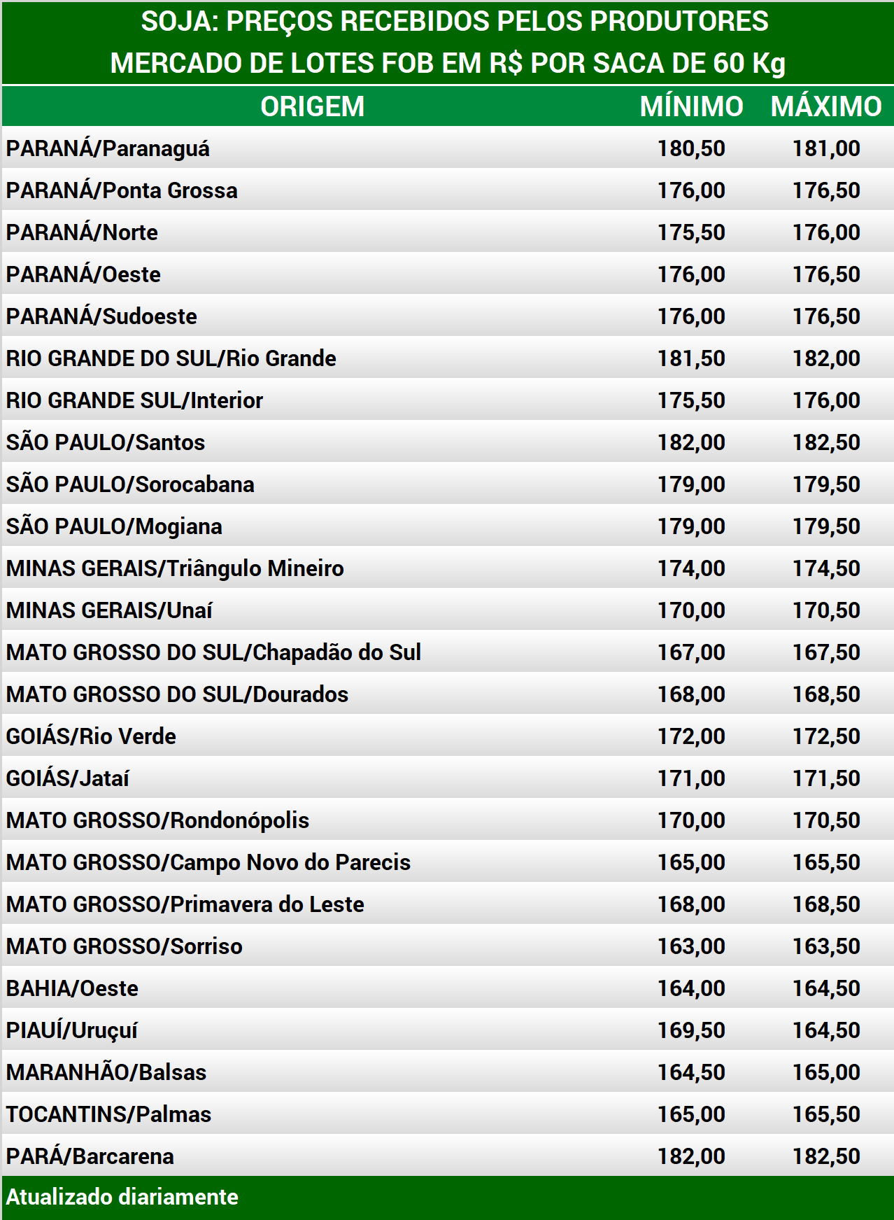 No Rio Grande do Sul, na região de Canoas, há registro de negócios a R$ 176,50 por saca de 60 Kg, para entrega imediata e pagamento em 1º de junho. No Porto de Rio Grande, há registro de negócios a R$ 180,50 por saca de 60 Kg, para entrega imediata e pagamento em 18 de maio. Para entrega imediata no Porto de São Francisco do Sul (SC), há registro de negócios a R$ 180,50 por saca de 60 Kg, para pagamento em 25 de maio. Na região de Vacaria, os compradores indicam R$ 174,50 por saca de 60 Kg, para retirada imediata e pagamento em 15 de junho. Para a negociação antecipada da safra 2021/2022, a indicação de compra é de R$ 160,00 por saca de 60 Kg, para retirada em Vacaria até 14 de abril do ano que vem e pagamento em 31 de maio de 2022. No Porto de Rio Grande, a indicação é de R$ 166,00 por saca de 60 Kg, para entrega em abril do ano que vem e pagamento no começo de maio de 2022. Em Mato Grosso do Sul, na região de Dourados, a negociação de soja no spot ocorre pontualmente. Os compradores têm mantido suas indicações a R$ 170,00 por saca de 60 Kg FOB, para embarque imediato e pagamento em 30 dias. Com relação à soja da safra 2021/2022, os compradores indicam R$ 150,00 por saca de 60 Kg, para embarque em fevereiro e pagamento em março.