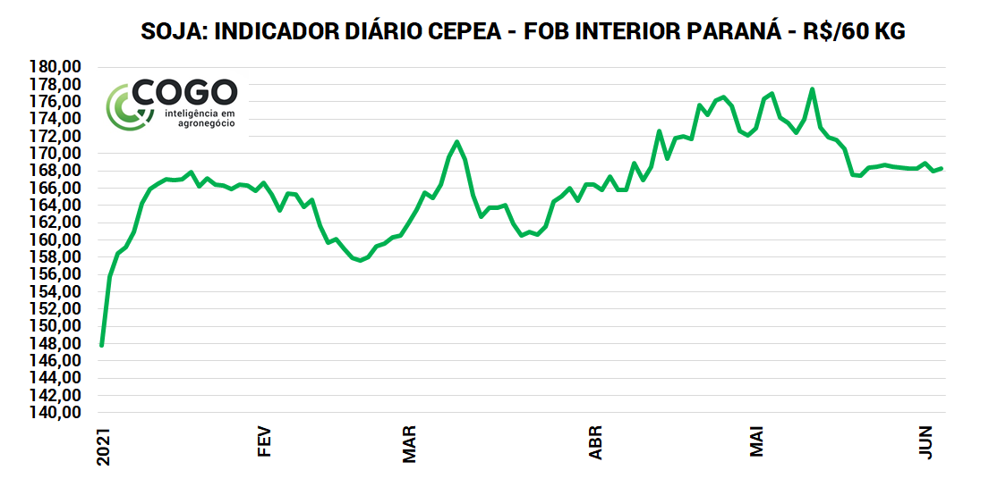 Desde o dia 12 de maio passado, quando a média ponderada da soja no Paraná – o Indicador CEPEA/ESALQ atingiu R$ 177,48 por saca de 60 Kg –, o recuo até a sexta-feira (4 de junho) é de R$ 9,22 por saca, para R$ 168,26. A recente reação dos futuros em Chicago foi anulada pela forte queda do dólar. O dólar se aproxima do patamar de R$ 5,00. O dólar fechou em uma mínima em um ano na sexta-feira (04/06), engatando o terceiro pregão de firme queda que levou a cotação à casa de R$ 5,03, com o câmbio repercutindo um rali global de ativos de risco que intensifica nos negócios o efeito do otimismo em curso sobre o Brasil. O dólar à vista caiu 0,93%, para R$ 5,037, o menor patamar desde 10 de junho de 2020. Os futuros de soja negociados na Bolsa de Chicago fecharam em alta expressiva na sexta-feira (04/06).
