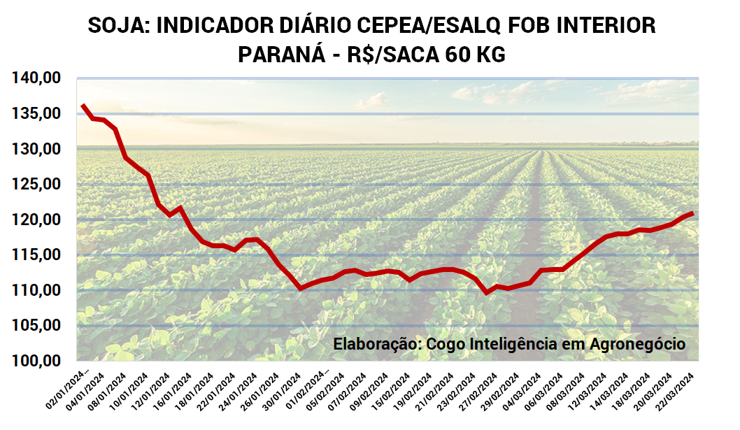 Diante disso e do clima na América do Sul, os preços futuros estão em alta na Bolsa de Chicago. O contrato Maio/2024 da soja registra avanço de 1,4% nos últimos sete dias, a US$ 12,12 por bushel. Os contratos com vencimento em maio/2024 do farelo de soja e do óleo têm alta de 2% e 0,8% no mesmo período, com respectivos fechamentos de US$ 379,52 por tonelada e de US$ 1.075,62 por tonelada. A valorização internacional, entretanto, é limitada pela demanda externa enfraquecida pelos grãos norte-americanos. De acordo com o relatório de inspeção e exportação do Departamento de Agricultura dos Estados Unidos (USDA), saíram dos Estados Unidos 35,76 milhões de toneladas de soja na parcial desta temporada (de setembro/2023 a 14 de março/2024), 18,8% a menos que o volume escoado no mesmo período da safra passada. Fonte: Cepea. Adaptado por Cogo Inteligência em Agronegócio.