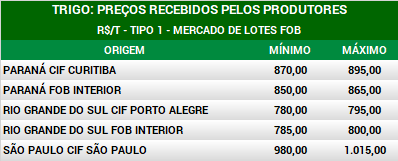 Os vendedores estão indicando muito acima do que custo do moinho suportaria. No Rio Grande do Sul, os moinhos indicam R$ 800,00 por tonelada FOB, para trigo tipo pão a ser retirado na Serra Gaúcha, enquanto os produtores indicam a partir de R$ 850,00 por tonelada, nas mesmas condições. No Paraná, os produtores indicam R$ 900,00 por tonelada FOB, para cereal tipo pão e retirada na região dos Campos Gerais, enquanto os compradores indicam entre R$ 870,00 e R$ 890,00 por tonelada FOB para cereal de mesma qualidade e entre R$ 920,00 e R$ 950,00 CIF em moinho da região metropolitana de Curitiba. Fonte: Agência Estado. Adaptado por Cogo Inteligência em Agronegócio.