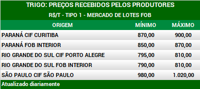 O mercado interno de trigo está praticamente parado. A comercialização, tanto futura como no spot continua em ritmo lento, apesar de o País estar no ápice da entressafra nacional. O primeiro Estado a começar a colher, o Paraná, tradicionalmente começa os trabalhos de campo apenas em setembro. No Rio Grande do Sul, que historicamente começa a plantar mais tarde, registrou atraso na semeadura desta safra e tende a iniciar a retirada do cereal do campo somente em novembro, trabalho que tradicionalmente ocorre em outubro. Os dois lados, produtor e moinho, aguardam a nova colheita. No Paraná, apenas contratos pontuais e para reposição de estoques são fechados. Na região dos Campos Gerais, há registro de negócios a R$ 950,00 por tonelada CIF, para entrega imediata e pagamento em 40 dias. O mercado está pouco ofertado.