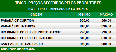 A comercialização de trigo no mercado interno é lenta. Apesar da entrada da safra nacional, com 70% da área colhida no Paraná, os negócios movimentados no disponível ainda apresentam volume pouco expressivo. No Paraná, na região de Ponta Grossa, lotes pontuais da safra atual giram em torno de R$ 850,00 e R$ 880,00 por tonelada FOB. No Rio Grande do Sul, moinhos e produtores aguardam a passagem do chamado período crítico de desenvolvimento do cereal para acelerar o ritmo de negócios.