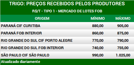 A colheita em estágio final vem confirmando a menor produção nacional de trigo. Diante disso, os produtores estão firmes em seus preços, sem grande interesse em negociar, na expectativa de novas valorizações, fundamentados no elevado patamar do dólar, que encarece as importações. Os compradores, por sua vez, se mostram abastecidos com o grão importado de períodos anteriores. Ressalta-se, ainda, que boa parte dos moinhos deve paralisar a moagem na próxima semana, para manutenção. Nesse cenário, a liquidez segue baixa. Nos últimos sete dias, no mercado de balcão (valor pago ao produtor), as cotações do grão registram alta de 0,6% no Paraná e de 1% no Rio Grande do Sul. No mercado de lotes (negociações entre empresas), os valores apresentam avanço de 1,1% em São Paulo e de 0,5% em Santa Catarina. No Paraná, as cotações se mantêm estáveis. No Rio Grande do Sul, por outro lado, os preços registram recuo de 0,7% no período.