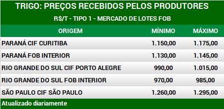 No mercado de lotes, os aumentos são de 1,8% no Paraná, de 1,1% no Rio Grande do Sul e de 0,8% em São Paulo. Esse cenário mostra que o mercado doméstico se mostra atrativo aos produtores (mesmo com as cotações do cereal não tendo absorvido todo o aumento observado no disponível). Estimativas já indicam crescimento na área com o cereal. Conforme dados do Departamento de Economia Rural (Deral/Seab) divulgados no dia 23 de março, a área da nova safra no Paraná deve totalizar 1,08 milhão de hectares, 4,7% a mais que na temporada passada (2018/2019). A produtividade pode crescer 32%, a 3,24 toneladas por hectare, resultando em produção de 3,4 milhões de toneladas, com forte alta de 39% em relação à temporada anterior. Apesar da possível maior área, os moinhos precisam buscar outras fontes de importação alternativas de matéria-prima a custos menores, a fim de sustentar a aquecida procura pelas farinhas e derivados do cereal. Neste cenário, moinhos solicitaram a isenção da Tarifa Externa Comum (TEC) para a importação do trigo argentino durante a pandemia.