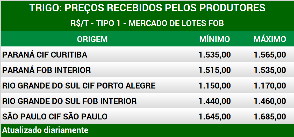 A negociação de trigo avança pouco no Paraná e no Rio Grande do Sul. Alguns compradores buscam lotes pontualmente, enquanto a maioria estava abastecida e evitava novas aquisições em virtude do frete elevado. Vendedores no Paraná estavam focados na movimentação de soja e milho, enquanto os do Rio Grande do Sul ainda buscavam negociar o cereal para liberar espaço em silos para a safra de verão, só que a valores mais altos do que os indicados por compradores. No Paraná, na região dos Campos Gerais, há ofertas a R$ 1.600 a R$ 1700 por tonelada FOB, mas muitos vendedores estão fora das negociações porque agora estão movimentando soja e milho.